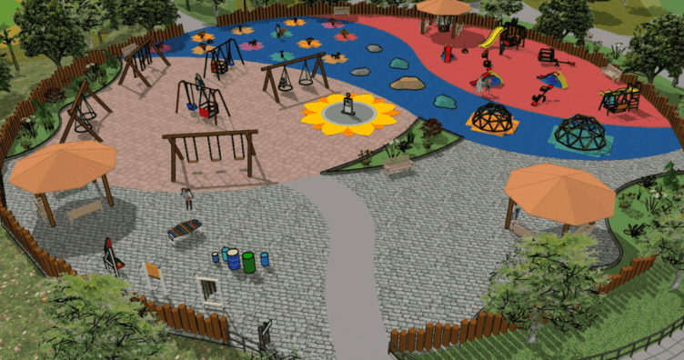 O espaço contará com trilha sensorial tátil e psicomotora, brinquedos sonoros de baixa intensidade com dissipação acústica pela vegetação, caixa de areia com brinquedos de movimento vestibular e psicomotor, jardim olfativo com plantas de cores suaves e aromas não agressivos, área de brinquedos psicomotores com piso emborrachado, brinquedos adaptados para PNE/PCD, brinquedos visuais e de sombra projetada, além de uma Casa de Apoio equipada com enfermaria e banheiros acessíveis e um Espelho d’Água para experiências e estímulos com a água.