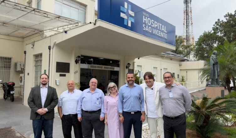 O prefeito Gustavo Martinelli esteve na manhã desta segunda-feira (17) no Hospital de Caridade São Vicente de Paulo (HSV) para anunciar a antecipação do 13º salário aos trabalhadores da instituição e dos Prontos Atendimentos (PAs). O anúncio foi feito ao lado do secretário de Finanças, Lucas Lusvarghi; da secretária de Saúde, Dra. Márcia Facci; do vereador e funcionário do hospital há 27 anos, Kachan Jr.; do superintendente do HSV, Amauri Liba; e do diretor-presidente do HSV, Denílson Cardoso de Sá.